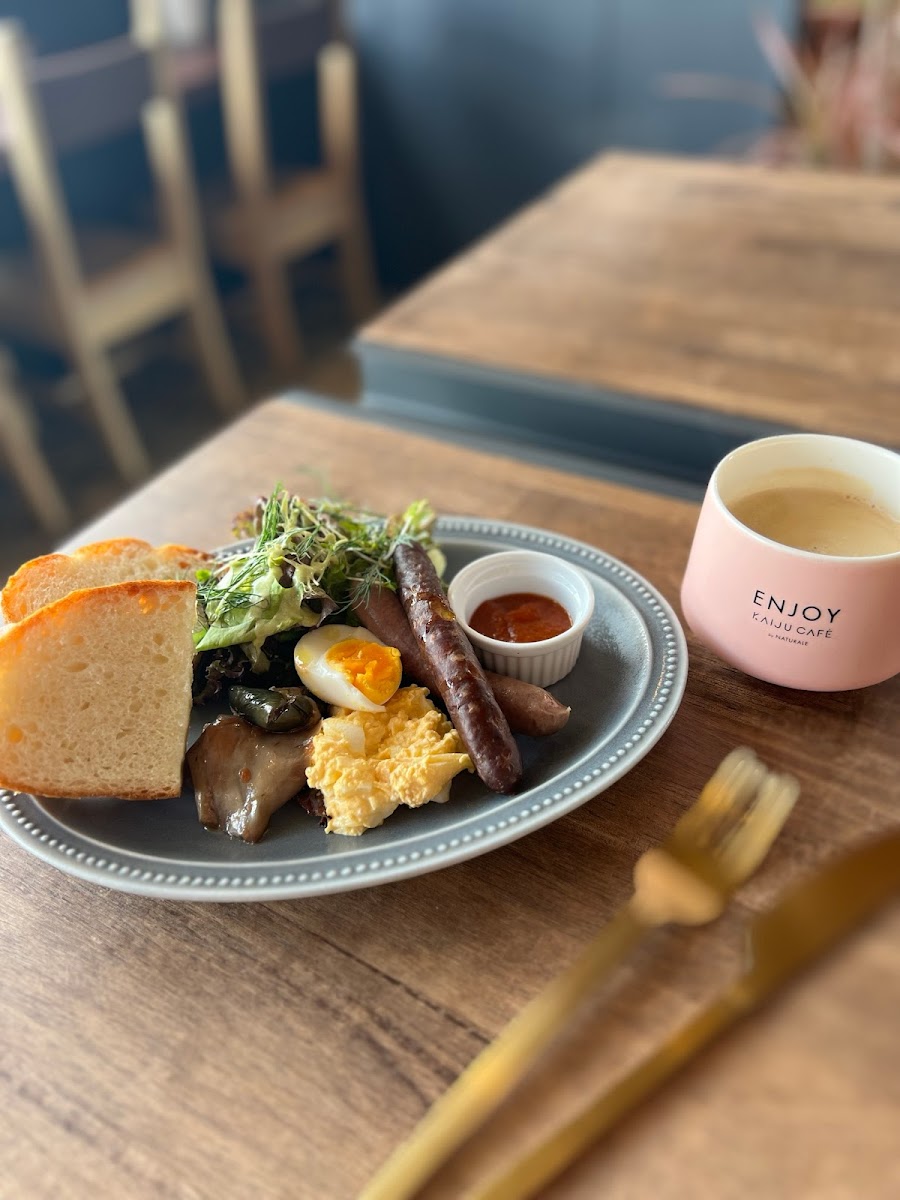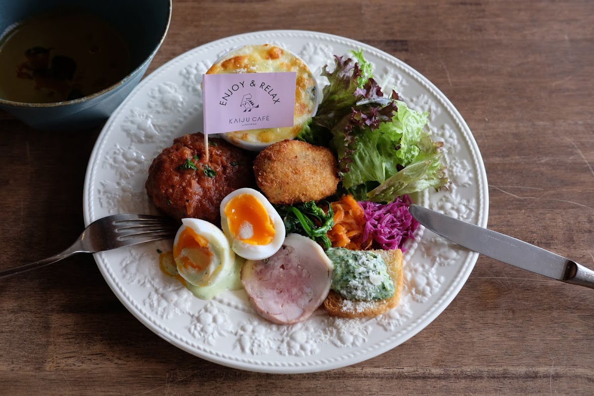 KAIJU CAFE also offers takeaway options ideal for picnics or road trips. Their フォカッチャたまごサンド picnic pack includes two delightful egg sandwiches and a cup salad dressed with basil, making it a convenient and tasty choice for those on the move.